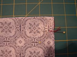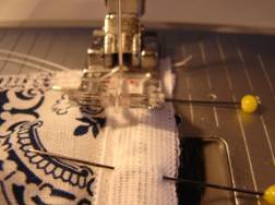 Den Reißverschluss schließen. Zwei Stecknadeln genau an die Stellen wo das Band anfängt und endet, quer einstecken. |