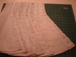 An den Kräuselfäden ziehen bis die Passe gleichmäßig auf den Rock passt und feststecken. Für den Reißverschluss in der hinteren Mitte muss an beiden Seiten etwa 1,2 cm Stoff glatt, also ungekräuselt bleiben. |